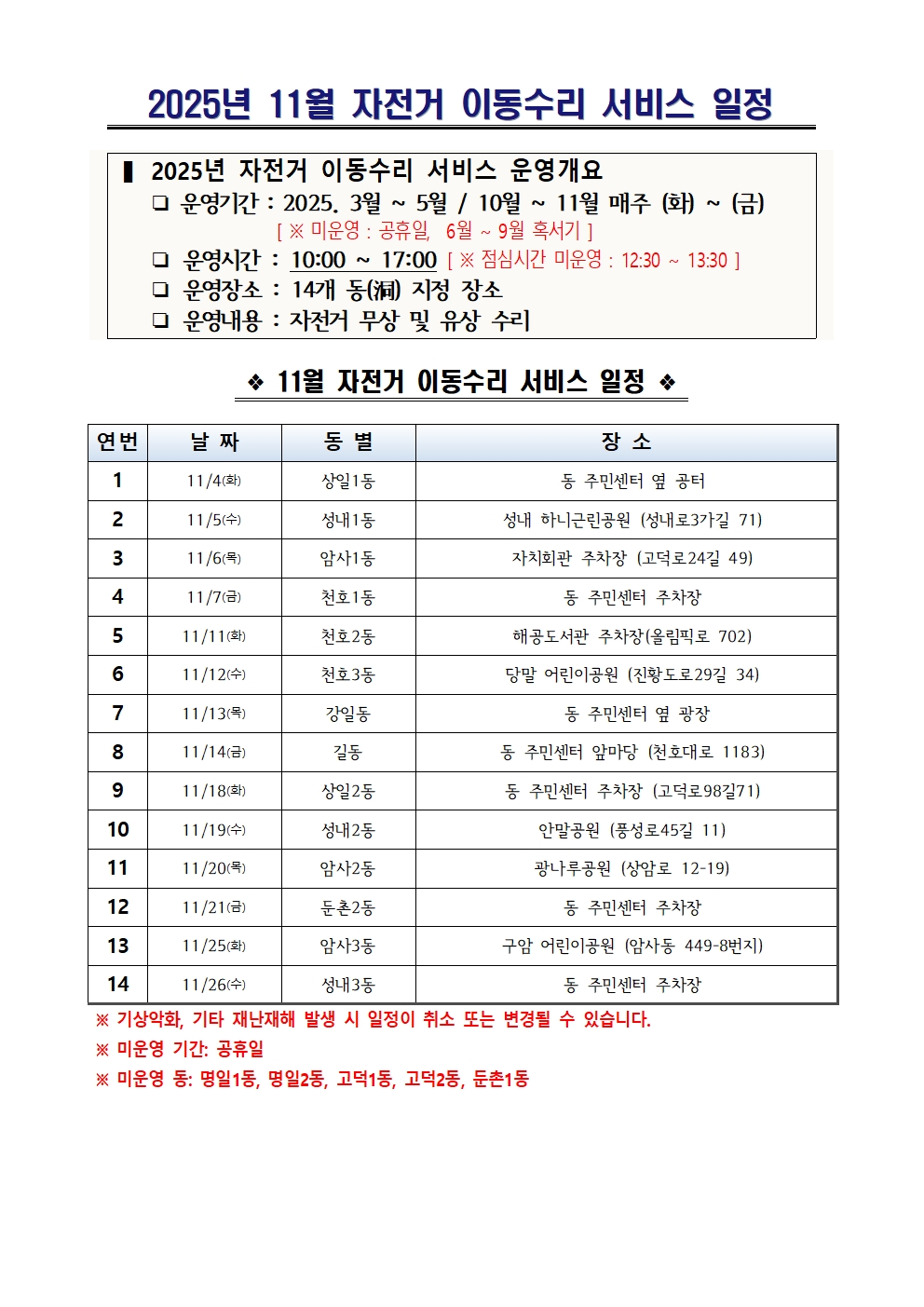 ※ 다만 점심시간(12:30~13:30)에는 운영하지 않으며, 일부 자전거에 대해서는 수리가 안 될 수도 있습니다. ◈ 문의 : 자전거 종합지원센터(☎02-428-1030~1) [2025년 이동수리 미운영 안내] *고덕1동, 고덕 2동, 명일1동, 명일2동, 둔촌2동 미운영 |