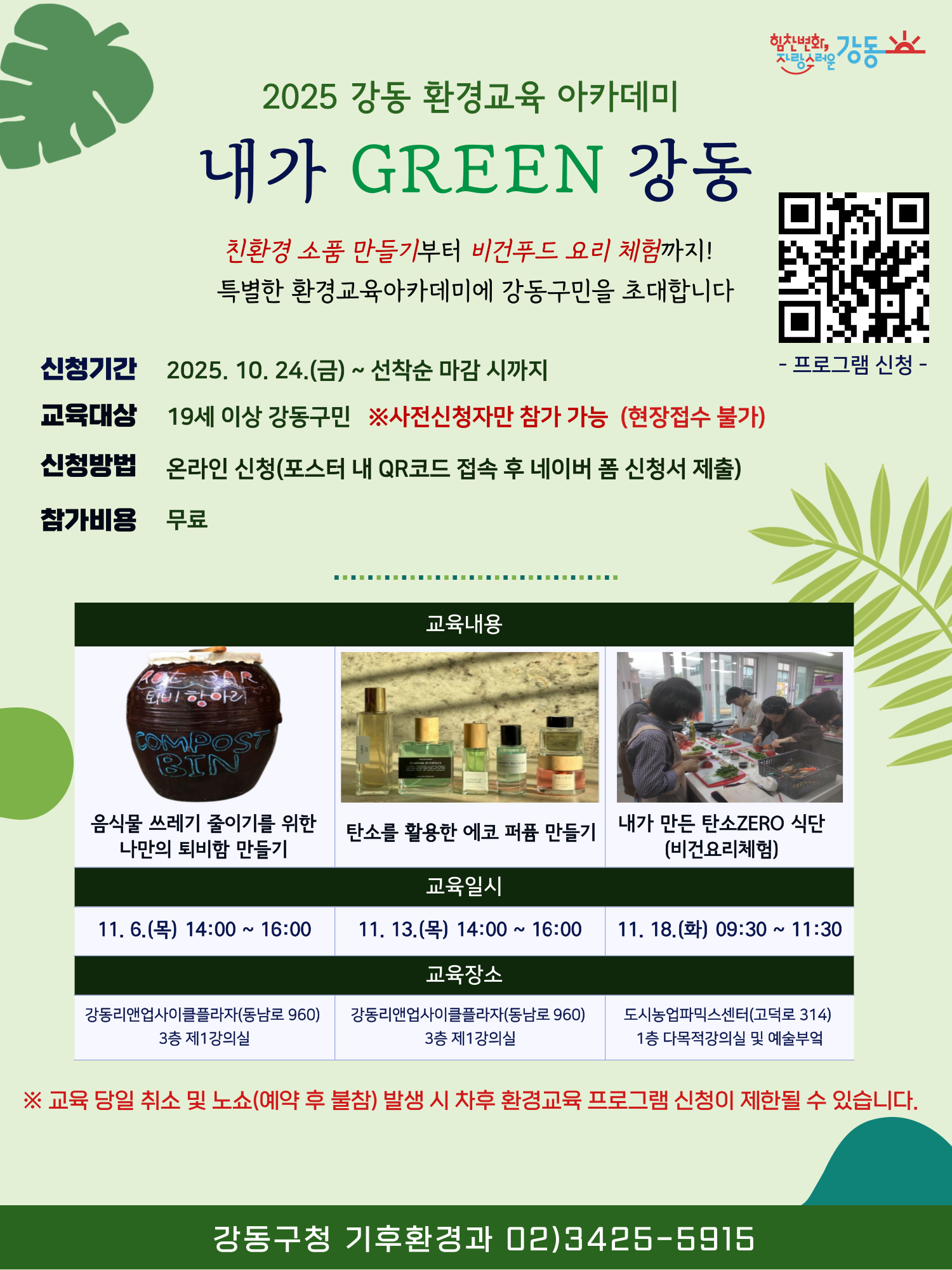 | 제목 | 2025 강동 환경교육 아카데미 "내가 GREEN 강동" 수강생 모집 | ||||||||||||||||||||||